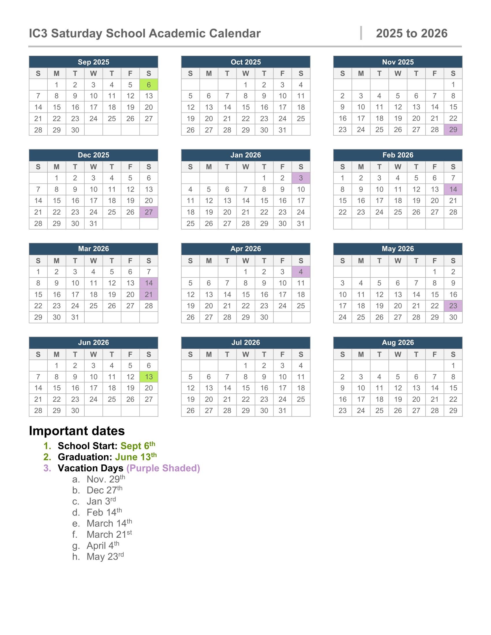 The tentative calendar for ICCC’s Saturday School is outlined below. Note that this calendar is subject to change.